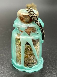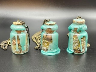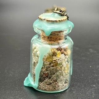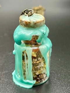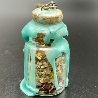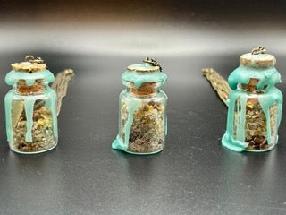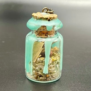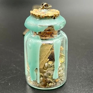 Prosperity && abundance spell jar worn as an amulet around a bronze necklace chain. Necklace length approx 17 inches. Amulet .6oz corked bottle. Limited selection, but will make more if they are sell well!